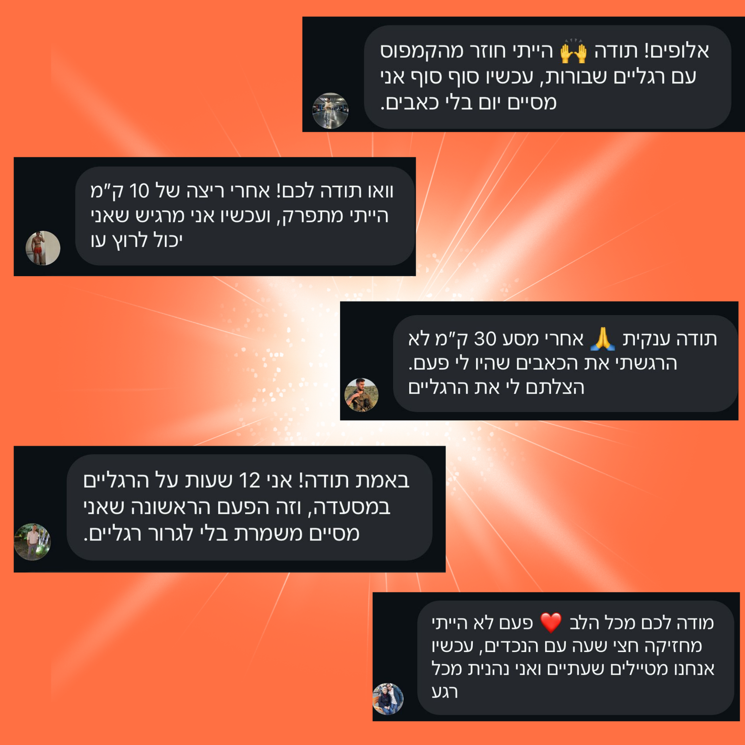 מהמבוגרים והגיל השלישי אמרו שהמדרסים החזירו להם ביטחון בצעדים והקלו על הכאבים וגרמו ליותר יציבות והרבה יותר נוחות ביום־יום.